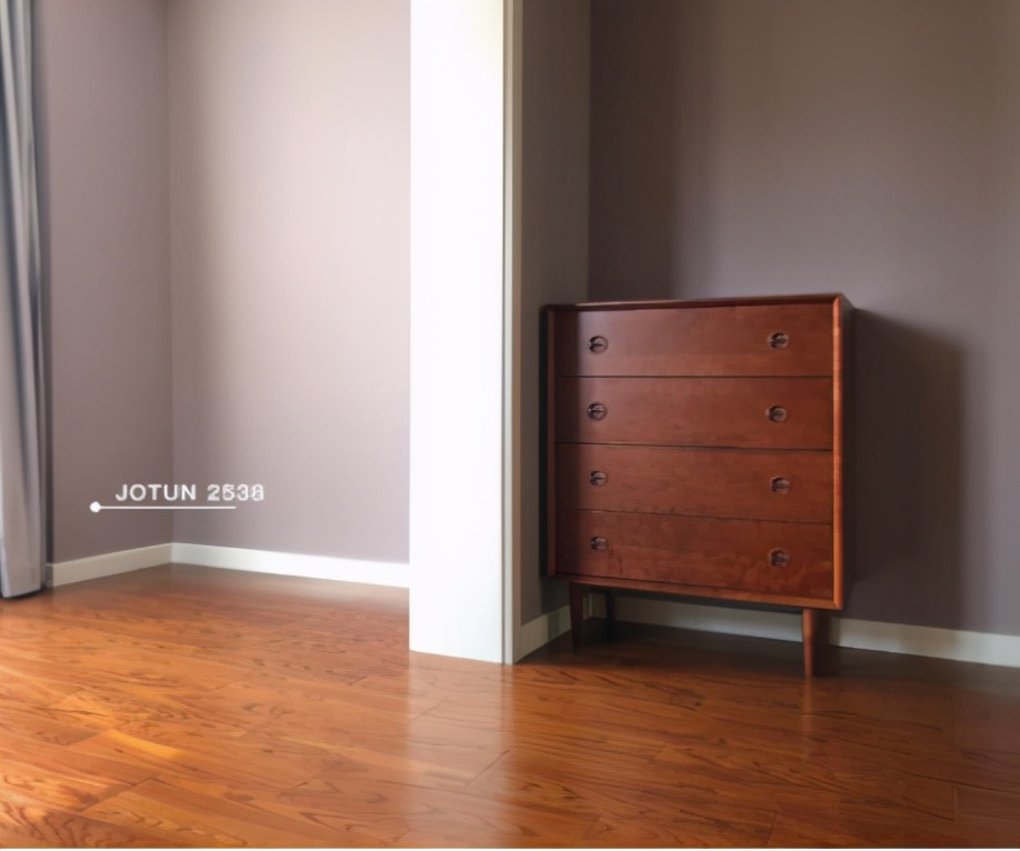 家具颜色也是必须要考虑的一点,要做到家具和墙壁颜色和谐。上图一个棕色的实木柜子,我们可以选择一个淡紫色的墙漆,两个颜色不会起冲突,看起来很和谐
