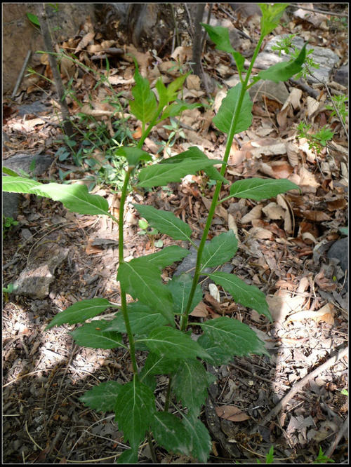 茎高40-80公分,不分枝,通常有短硬毛和长柔毛;基生叶心形,大并且有长柄,茎生叶无柄,叶片椭圆形或窄卵形,叶边有不整齐锯齿,两面有稀疏毛;
