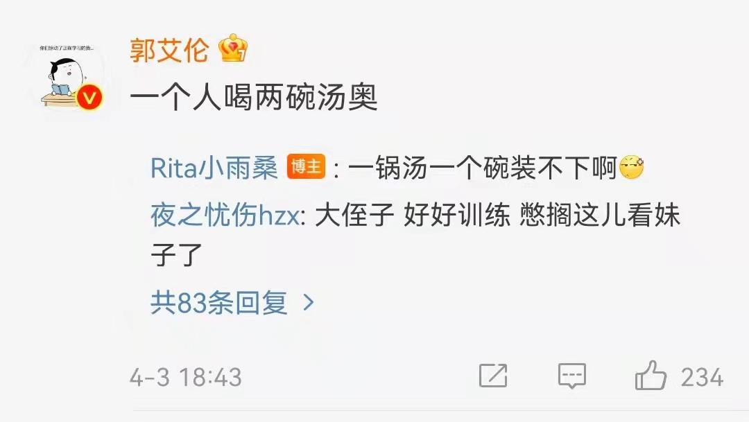 CBA球员郭艾伦在Rita微博下留言道:“一个人两碗汤奥”,随后,Rita第一时间回复道:“一锅汤一个碗装不下啊”。