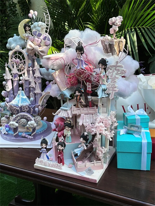 收到的礼物也真是很高级,不说其它单单就是这蛋糕都太美了!紫色的城堡公主,各种古风造型的人偶,这是蛋糕吗?说是高级艺术品都有人信,怎么忍心吃掉?