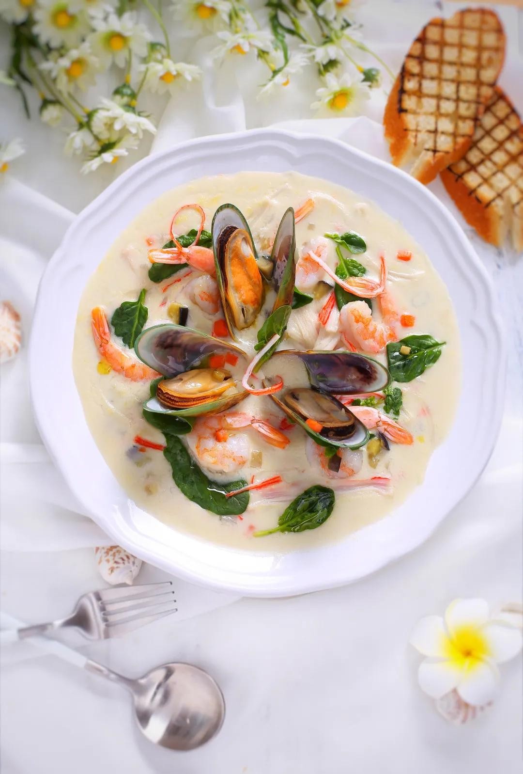 对于喜食海鲜的吃货来说,这道餐前海鲜奶油浓汤最适合不过了。此汤集合了各种海鲜的精华,鲜香味浓,营养价值也是极高。