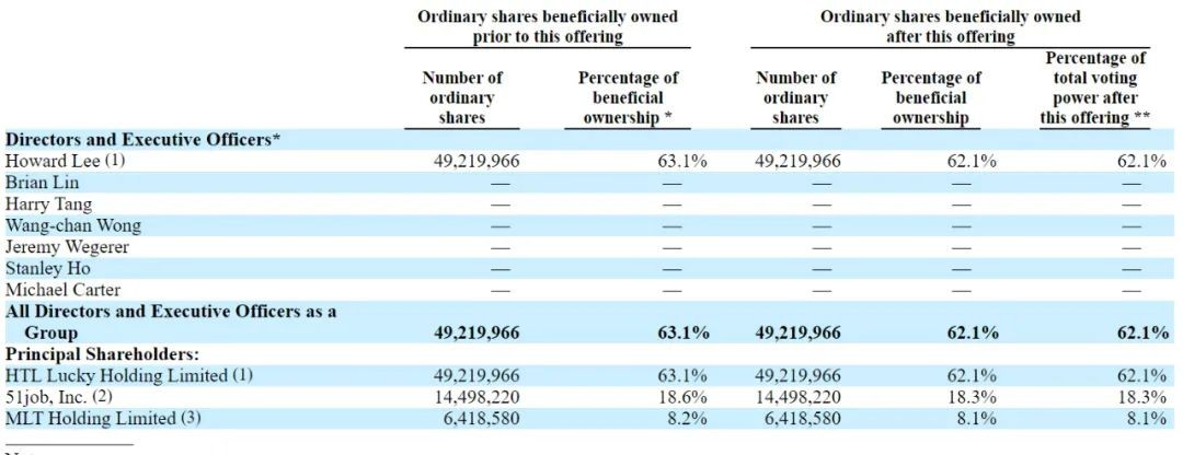 IPO后,李明桦持股62.1%,前程无忧持股18.3%,孟璐婷(Luting Meng)持股8.1%。