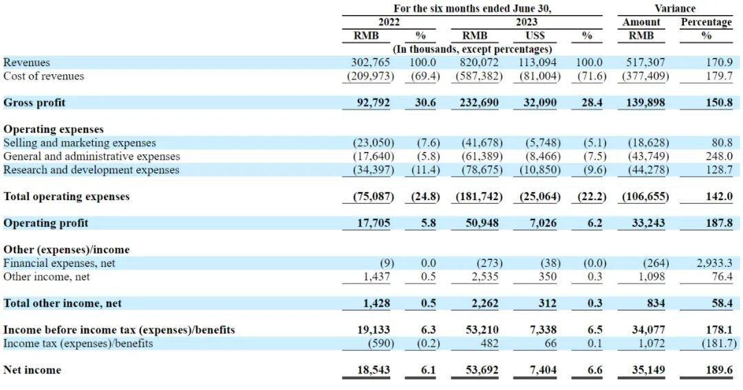 罗科仕2023年上半年营收为8.2亿元(约1.13亿美元),上年同期营收为3亿元;毛利为2.32亿,毛利率为28.4%;费用为1.82亿元;运营利润为5095万元,净利为5369万元。