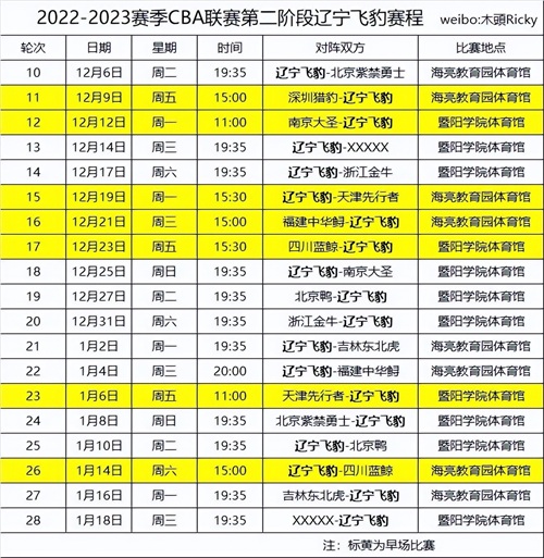CBA联赛的这个窗口期已过大半,第二阶段的比赛将会在12月6日开始。在第二阶段的比赛开始之前,CBA联赛将会补办上赛季的全明星比赛。日前CBA公司公布了第二阶段的赛程,总共有19轮比赛,截止到1月18日结束。作为联赛的卫冕冠军,辽宁男篮在第二阶段的表现肯定饱受关注。从赛程安排上来看,辽宁男篮第二阶段首战的对手是北控男篮,这场比赛被安排在12月6日的19点35分进行。来看一下辽宁男篮第二阶段的具体赛程,这是从网上引用的,应该是辽宁球迷制作的,“XXXX”代表的是广东男篮。