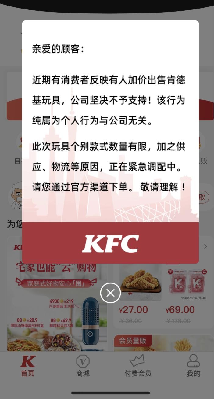5月24日,肯德基官方App发布公告称,近期有消费者反映有人加价出售肯德基玩具,公司不予支持,该行为纯属为个人行为与公司无关。此次玩具个别款式数量有限,加之供应、物流等原因,正在紧急调配中。