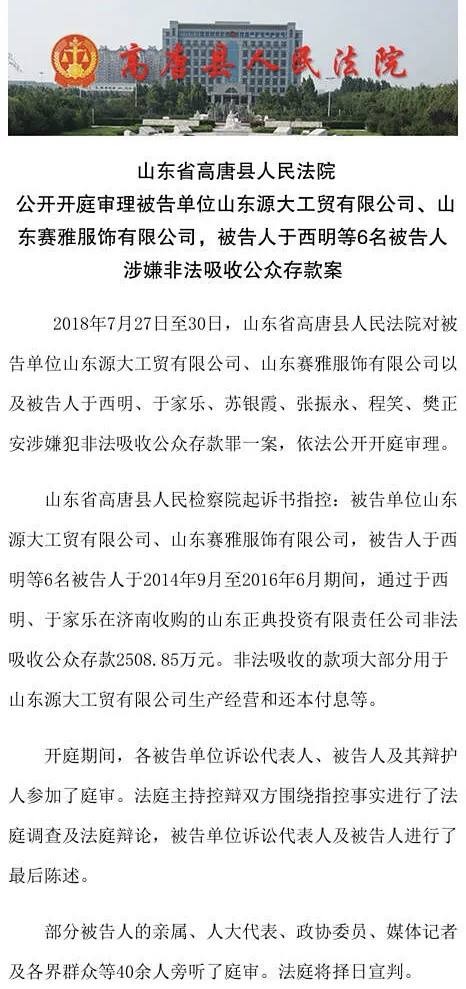 2018年7月27日,苏银霞等人涉嫌非法吸收公众存款一案开庭审理,于欢家人被指控涉非法吸收公众存款2500余万元。