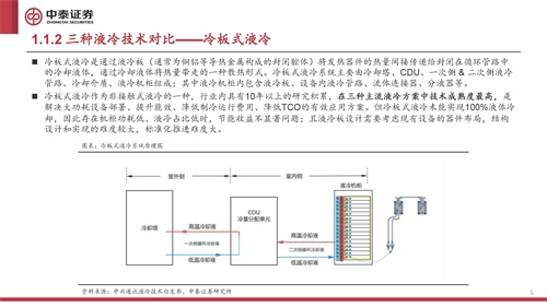 冷板式液冷作为非接触式液冷的一种,行业内具有10年以上的研究积累,在三种主流液冷方案中技术成熟度最高,是 解决大功耗设备部署、提升能效、降低制冷运行费用、降低TCO的有效应用方案。但冷板式液冷未能实现100%液体冷 却,因此存在机柜功耗低、液冷占比低时,节能收益不显著问题;且液冷板设计需要考虑现有设备的器件布局,结构 设计和实现的难度较大,标准化推进难度大。