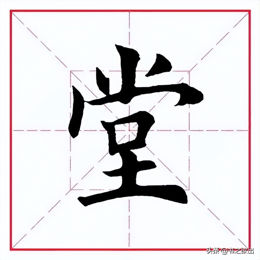 上部“党字头”整体宽放,首笔中竖斜切起笔,角度略平,稍厚重,向下略轻,不要写长,略左斜;左右两个点笔要紧凑呼应,左低右高,呈合抱之势;左竖离中竖不要远,露锋入笔后稍向左斜,勿长,收笔稍重;横钩与左竖笔虚接,横画抗肩,行笔要轻,过中竖后稍长,到位后稍抬笔锋然后顿笔向左下方出钩,钩身勿长,遒劲有力。