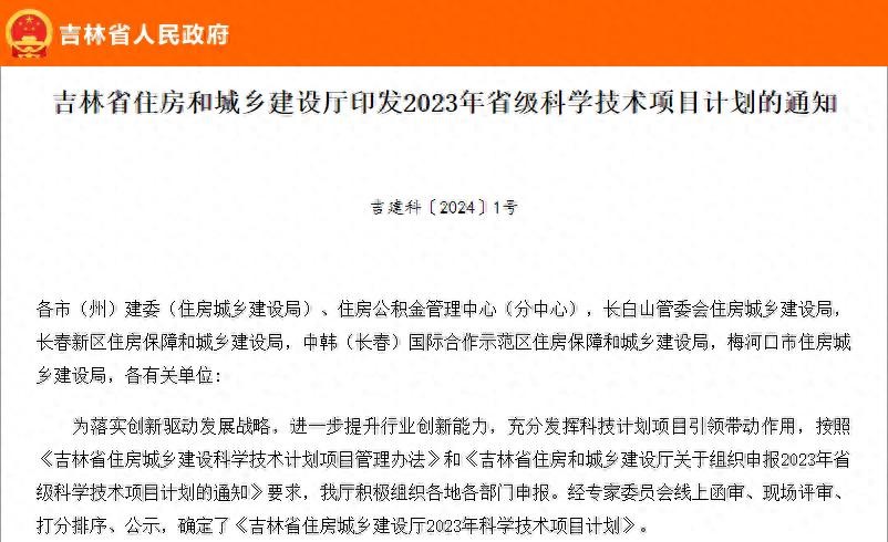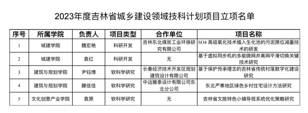 近日,吉林省住房和城乡建设厅下发《吉林省住房和城乡建设厅印发2023年省级科学技术项目计划的通知》(吉建科〔2024〕1号),公布了省级科学技术计划项目立项名单。经省住建厅专家委员会线上函审、现场答辩评审,长春建筑学院5个项目在科技成果转化、科学技术创新性方面较为突出,获批立项。