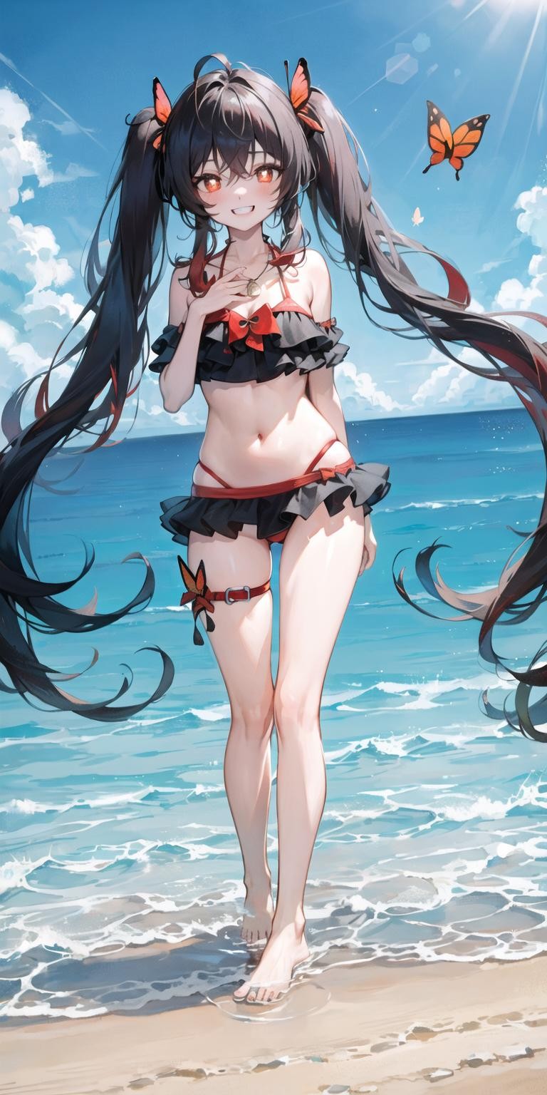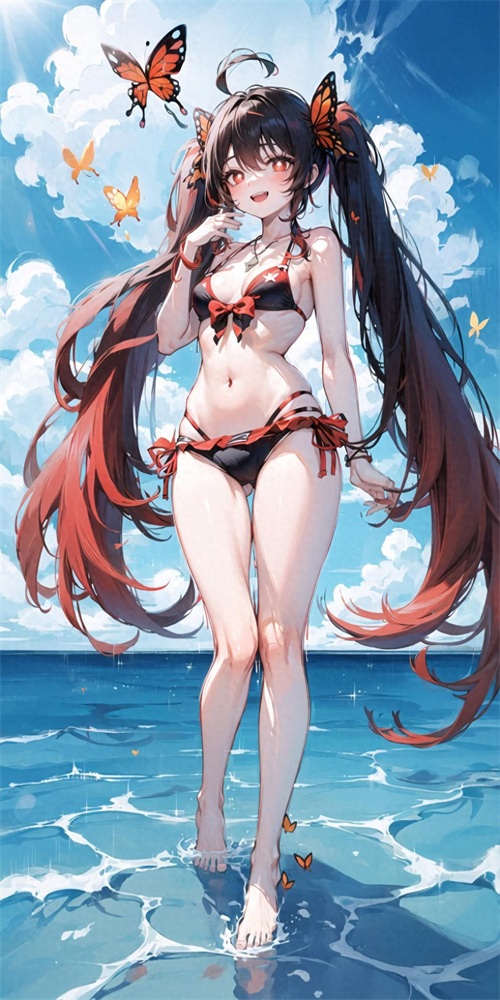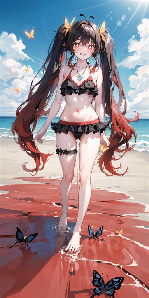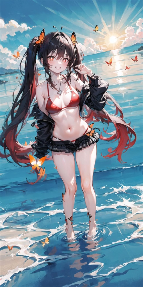 炎炎夏日,阳光灿烂,海滩上游玩的人们穿着各式各样的泳装,在细沙滩上留下一道道曼妙的身影。其中一位少女穿着一件明亮的比基尼,手中捧着一只绚丽多彩的蝴蝶。她的脸上带着害羞而又甜美的微笑,看起来格外动人。