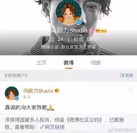 4月6日,赵立新更是注销了微博。目前,@演员赵立新 的微博显示用户不存在,其工作室微博@向新力Studio 也在深夜清空所有内容,包括致歉声明。