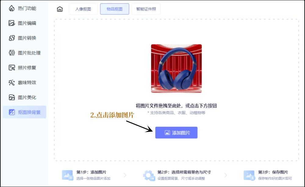 第二步:点击图中的【添加图片】,上传物品的图片到页面中来。支持多种类型的物品进行抠图操作。