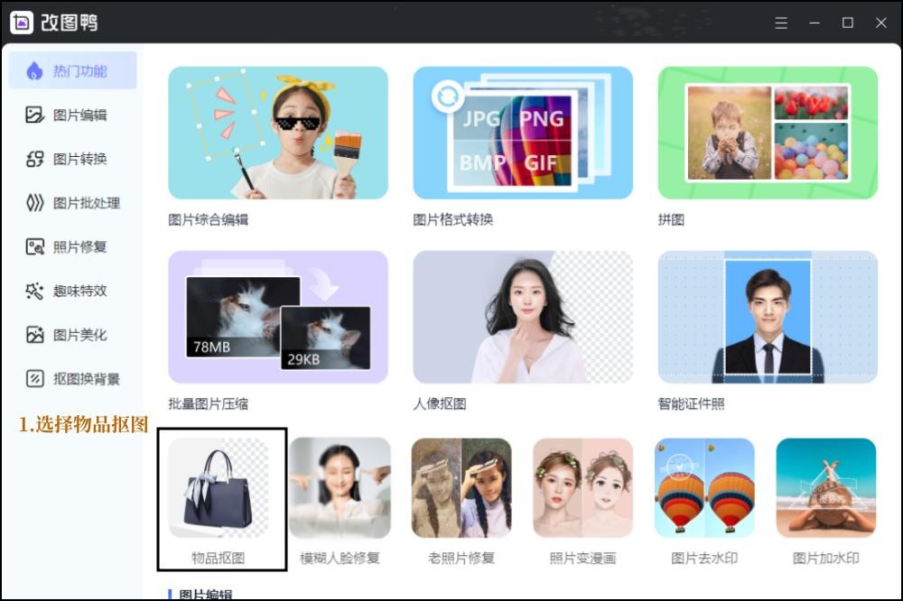第一步:在正式开始操作前,我们先将【改图鸭】安装到电脑上,打开软件,选择【物品抠图】功能。