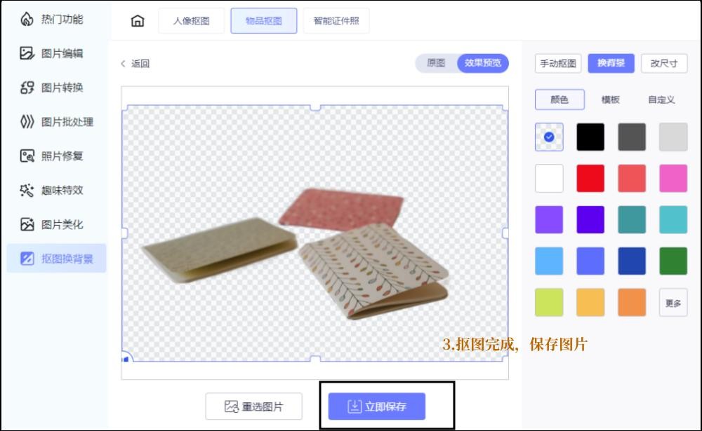 第三步:图片选择完成,等待抠图后的物品图片即可。在页面的右侧,还可以自行设置抠图方式,给图片换背景。