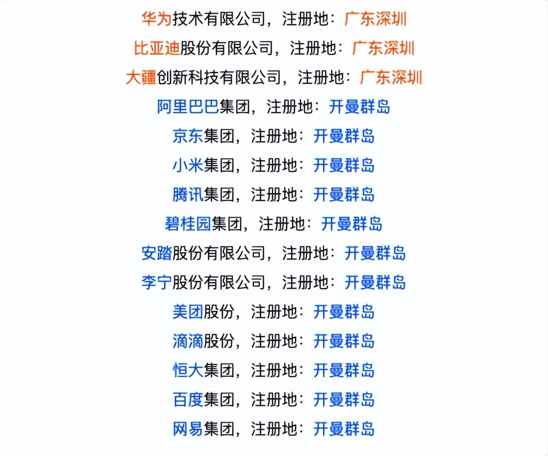 目前,据网上公开可查到的信息,我国的阿里巴巴、百度、京东、腾讯、网易、小米、联通、新浪、联想、SOHO、恒大、汇源、新世界、蒙牛、盛大、分众传媒、前程无忧、巨人网络、海底捞、碧桂园、李宁、安踏、中国移动、奇虎360都是在开曼群岛注册有子公司的。据说,大部分在美国或者香港上市的企业,其注册地都是在开曼群岛。