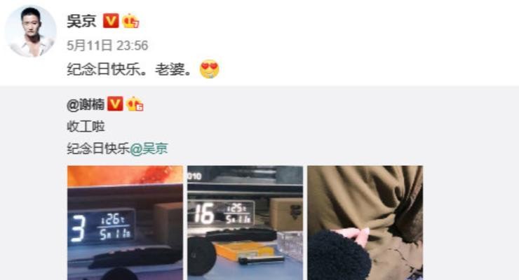 5月11日,谢楠在网上晒出两人的合照,庆祝结婚7年的纪念日,吴京随后就转发并示爱谢楠直呼“老婆”。