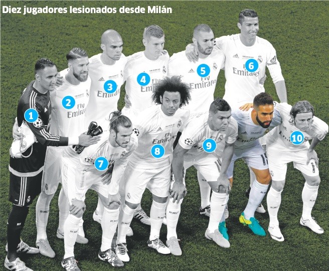 在欧洲杯决赛上,C罗被佩耶撞伤,从而错过了皇马的欧洲超级杯以及西甲前几轮的比赛。同时与C罗一同缺阵还有门将纳瓦斯,这位哥斯达黎加国门由于伤病问题甚至缺席了今年夏天的百年美洲杯。直到9月28日对阵多特的欧冠时才回到首发阵容中。在赛季初的前几轮比赛中,本泽马同样因伤缺阵。