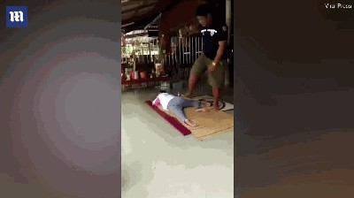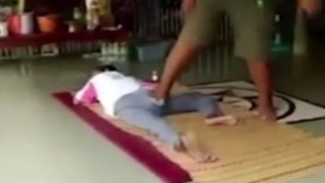 “快乐医生”本名查温蒙(Kiattisak Chaiwimon),从视频中可以看到,他先把脚放在蒂特萝的腿部和臀部,随后用力踩下去。躺在地上的蒂特萝似乎感到很痛苦,大声叫了出来,要求按摩师停下来。