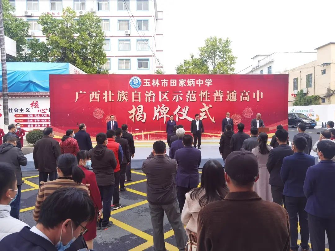 12月15日,玉林市田家炳中学“广西壮族自治区示范性普通高中”揭牌仪式在该校大门口举行。