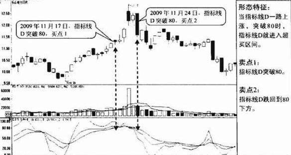 11月24日,随着股价下跌,指标线D也跌落到80下方。此时看获信号已经确立。投资者应该将手中剩余的股票全部卖出。