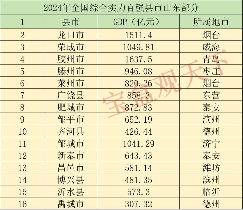 2024年山东综合实力全国百强县市,龙口领衔,沂水跻身榜单