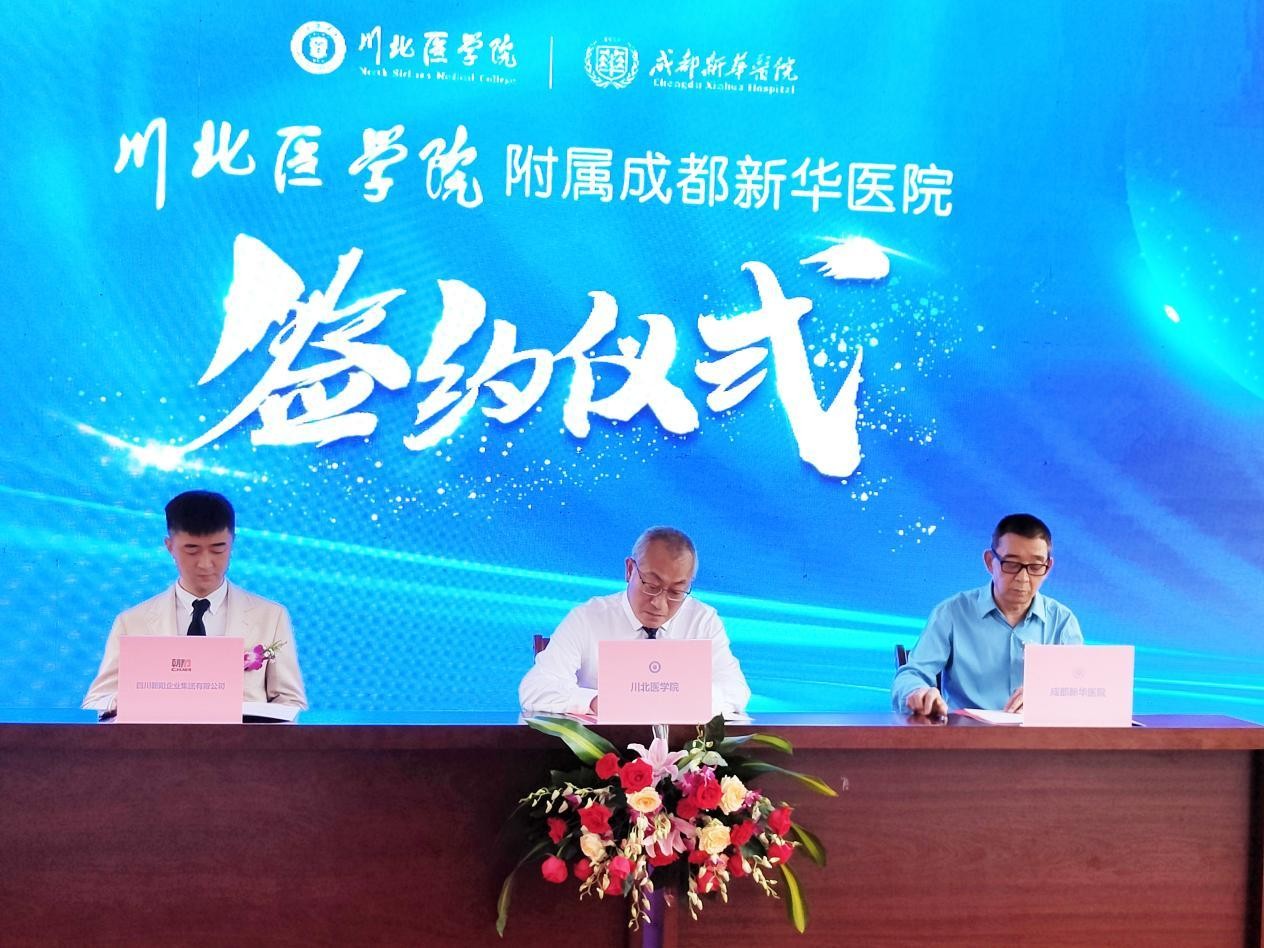 揭牌典礼上,川北医学院校长杜勇、四川朝阳企业集团总经理曹洪、成都新华医院法人曹昌华共同签订《川北医学院与四川朝阳企业集团合作协议》。