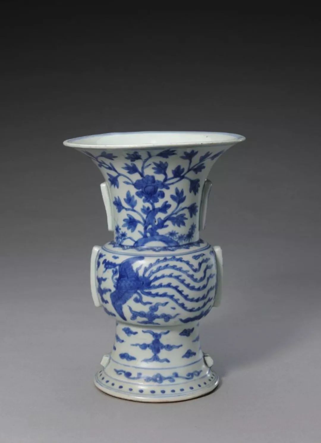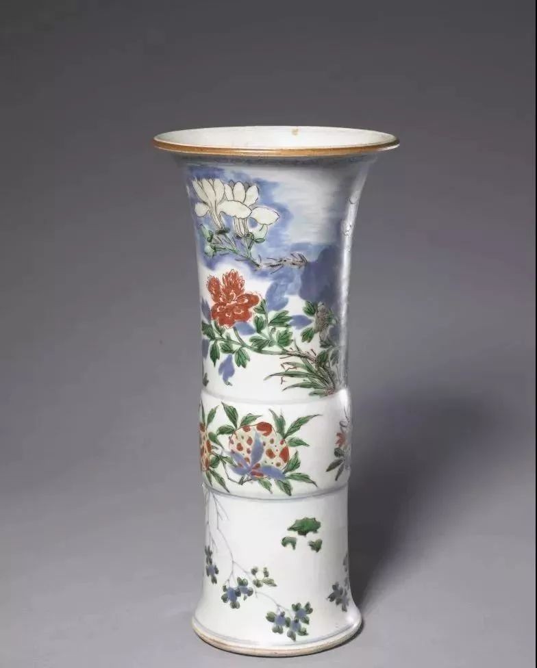 花觚的时代特征十分明显,明代的花觚主要是三段式的,上面是喇叭口,中间是鼓腹,下部是凤尾,器型古朴典雅。我们常见的明代花觚以五彩最为贵重。一般都呈现出纹饰繁密,层次分明,色彩艳丽,风格硬朗的特点。