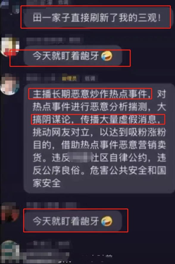 但前段时间,田静直播却被质疑恶意炒作,甚至还有人建了一个群,专门恶评田静一家人,有网友摸进群中,截取了一段聊天内容。其中管理员称主播长期恶意炒作热点事件,大搞阴谋论,传播虚假信息,违反平台社区自律公约。