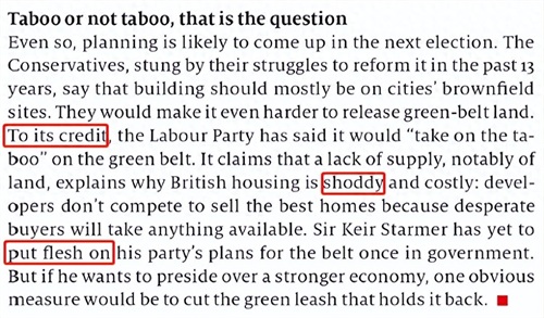 即便如此,规划问题仍有可能在下届大选中提出。在过去13 年中,保守党一直在努力进行规划改革,他们认为大部分建筑都应建在城市的棕色地带,因为棕色地带将加大释放绿化带土地的难度。值得称赞的是,工党表示其将 "挑战 "绿化带的"禁忌"。工党声称,供应不足,尤其是土地供应不足,是英国住房质量低劣、成本高昂的原因所在:开发商不会竞相出售最好的住房,因为绝望的买家会接受任何现有的住房。克尔·斯塔默爵士(Sir Ker Starmer)在执政后尚未对其政党的住房带规划进行具体阐述。但如果他希望主导更强大的经济,那么应采取显而易见的措施就是切断阻碍经济发展的绿色束缚。