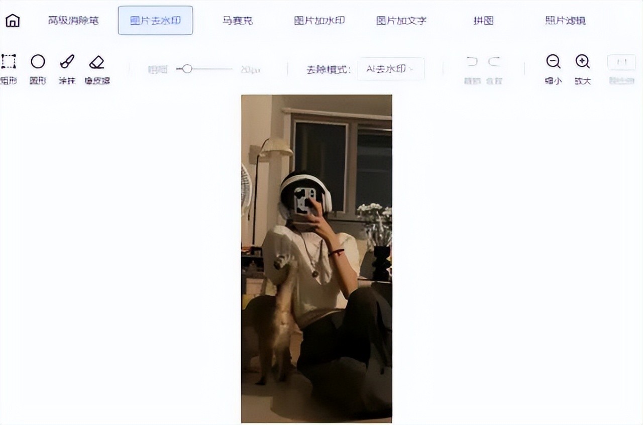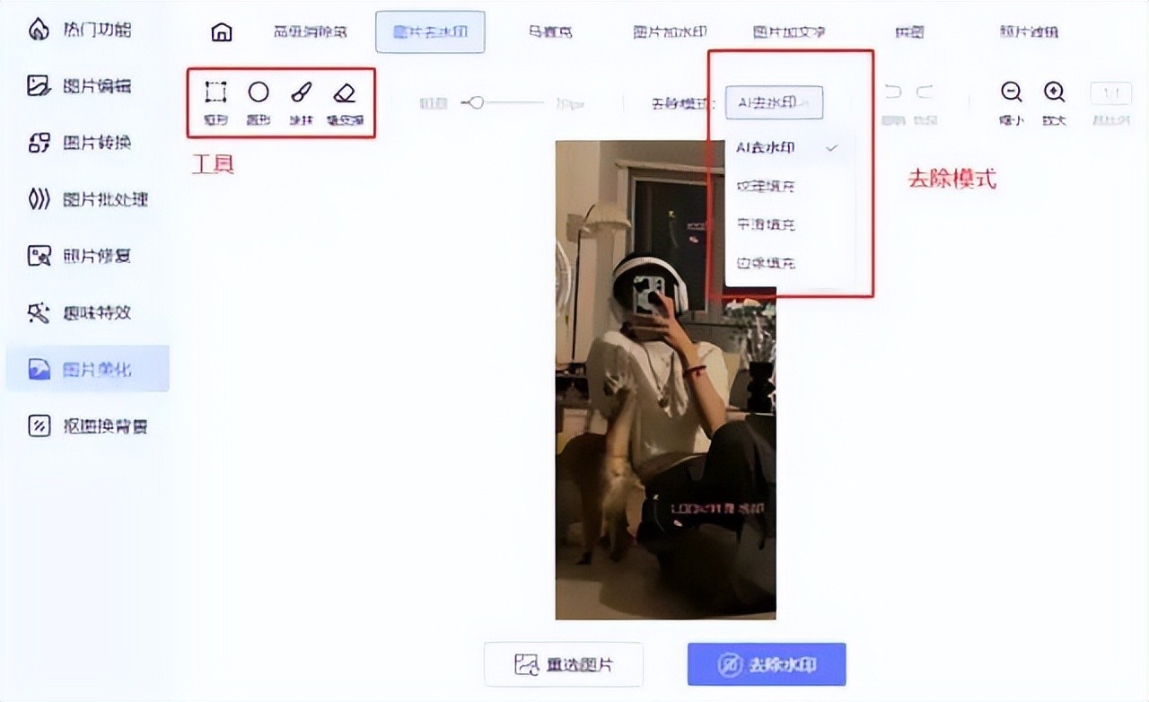 步骤二:上传需要去水印的图片,多个水印也可以同时去除!还可以根据自己的需求选择工具,以及模式,任意的放大和缩小,操作也很简单将矩形或圆形的工具框在有水印的地方,系统就会自动进行去水印操作!