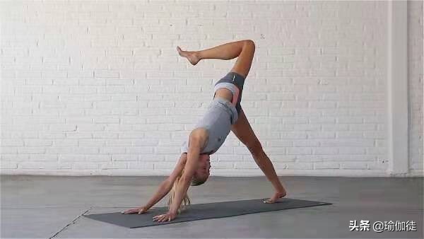 修改:如果你在这个体式上有困难,专注于在下犬式中保持正确的对齐,并使用文章前边比较温和的开髋动作来增强你的灵活性。