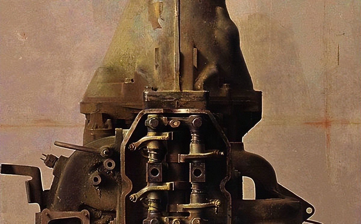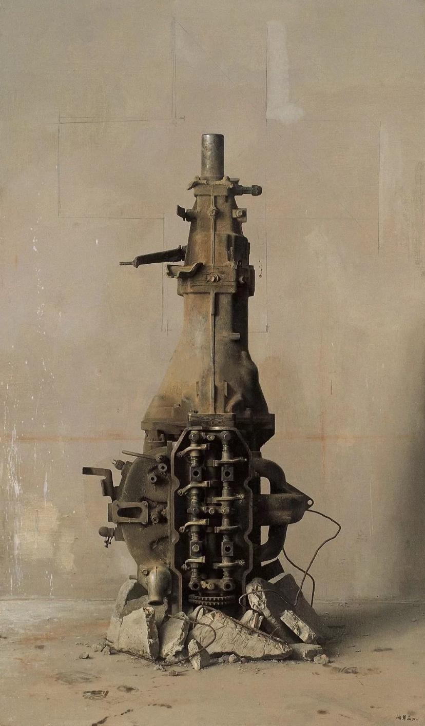 这幅画便是冷军在早期“新产品设计系列”中的《丰碑》(上图),这幅画与冷军早期的作品风格几乎没什么变化,然而名字却寓意深厚,因为当时身处在中国改革开放的时代,工业发展迅速,而冷军则用发动机,代表了工业,而发动机竖立的样子,又像是一个纪念碑,也就是寓意着工业时代发展的一个纪念碑。
