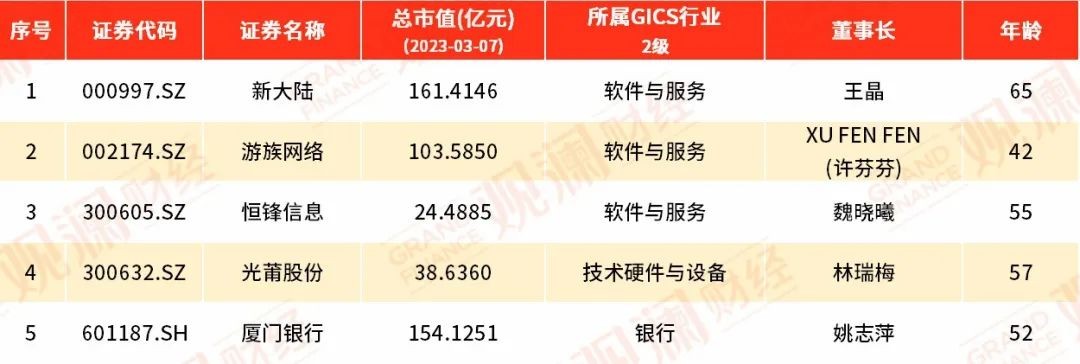在这5位女董事长执掌的企业里,新大陆、厦门银行、游族网络的市值超过百亿。从行业上来看,这5家福建A股上市公司主要分布在软件与服务、技术硬件设备以及银行等专业领域。