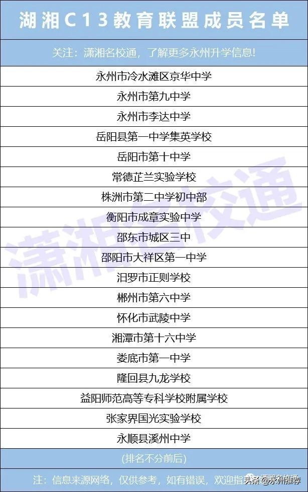 湖湘C13教育联盟是由湖南省内各地市优质初中学校为了应对2024届湖南省统一中考而共同发起成立,包括:岳阳县第一中学集英学校、湖南衡阳市成章实验中学、株洲市第二中学初中部、娄底市第一中学、邵东市城区三中、隆回县九龙学校、岳阳市第十中学、汨罗市正则学校、常德芷兰实验学校、郴州市第六中学、永州市冷水滩区京华中学、永州市李达中学、永州市第九中学、益阳师范高等专科学校附属学校、怀化市武陵中学、张家界国光实验学校、湘潭市第十六中学、永顺县溪州中学、邵阳市大祥区第一中学