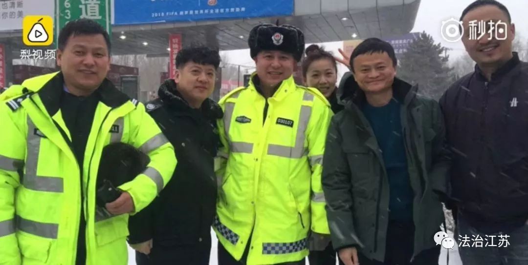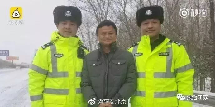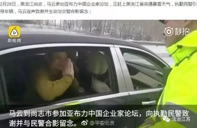 今年2月28日,黑龙江尚志,马云参加亚布力中国企业家论坛,正赶上黑龙江省突遇暴雪天气,执勤民警引导车辆,马云连声致谢并主动与交警合影留念: