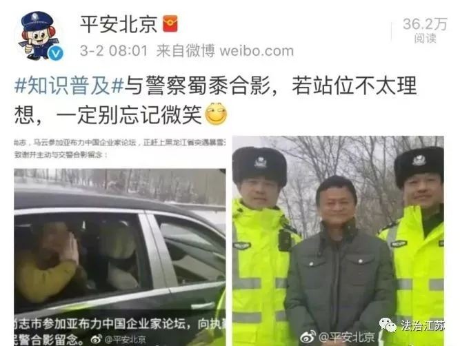 为此,北京市公安局官方微博 @平安北京 还发布了马云同交警合影的照片,并配文道,“与警察蜀黍合影,若站位不太理想,一定别忘记微笑”。