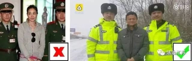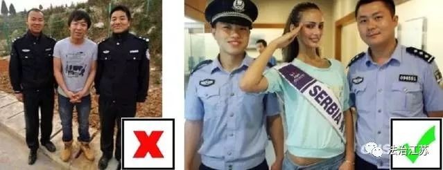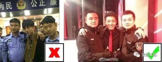 与警察合影不能双手交叉放在下面。被用来举例最多的就是黄渤。