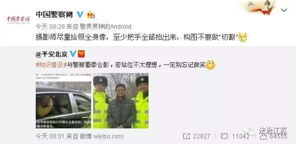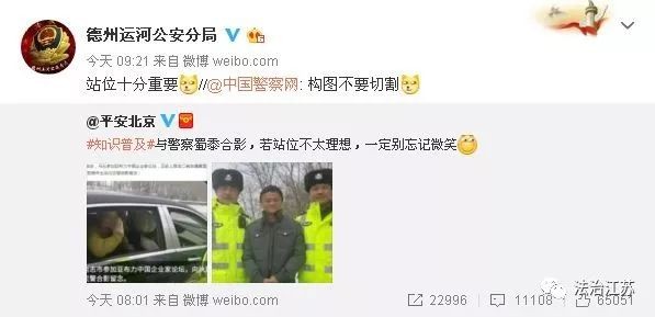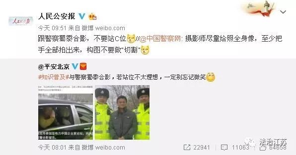 “。。。大家记住以后和警察合影不要站中间,站中间也不要抱手,大忌。。。 ”