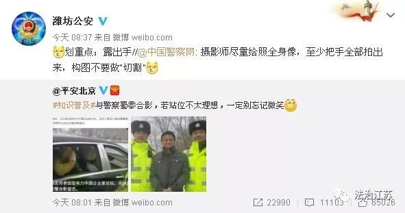 为此有人建议:跟警察蜀黍合影,不要站C位(即center,中间位置的意思),照片尽量要全身像,手腕处拍清晰,千万不要有遮挡,构图不要做“切割”。