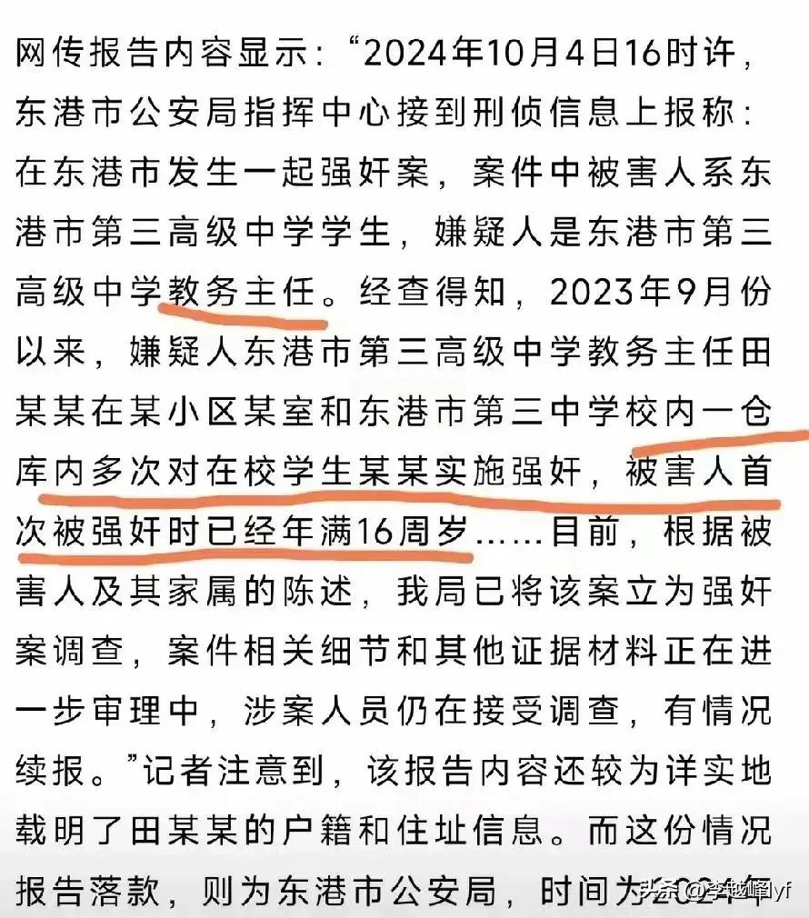 根据网传的内容显示,当地警方接到刑侦信息上报称,在东港市发生了一起强奸案件,被害人为东港市第三高级中学的学生,嫌疑人是该校的教务主任。