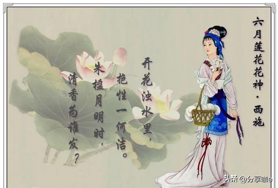 据说荷花花神是西施,她曾在苏州锦帆泾留下采莲故迹。也有人说,西施帮助越国打败吴国后,越王把西施带回越国,但女王非常嫉妒西施的美丽,把西施抓到河边,绑上巨石,沉入河底。人们不相信西施会死。传说她做了荷花神,住在一个小岛上。每年采莲节,她都能被在湖边采莲的女孩看到。