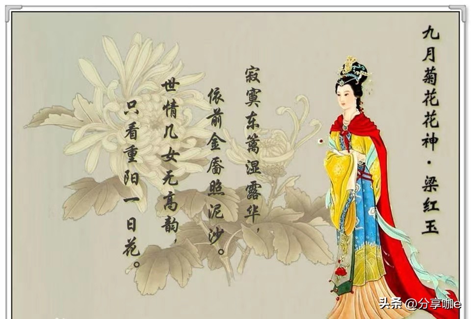 农历九月的深秋,是菊花开得最艳的时候,所以又叫菊月。在菊花这个璀璨的香国里,有的端雅大方,有的龙飞凤舞,有的壮丽如彩虹,有的洁白赛霜雪,相当迷人。九月菊花花神据说是陶渊明。这位东晋田园诗人以菊为友,曾写过许多咏菊诗。