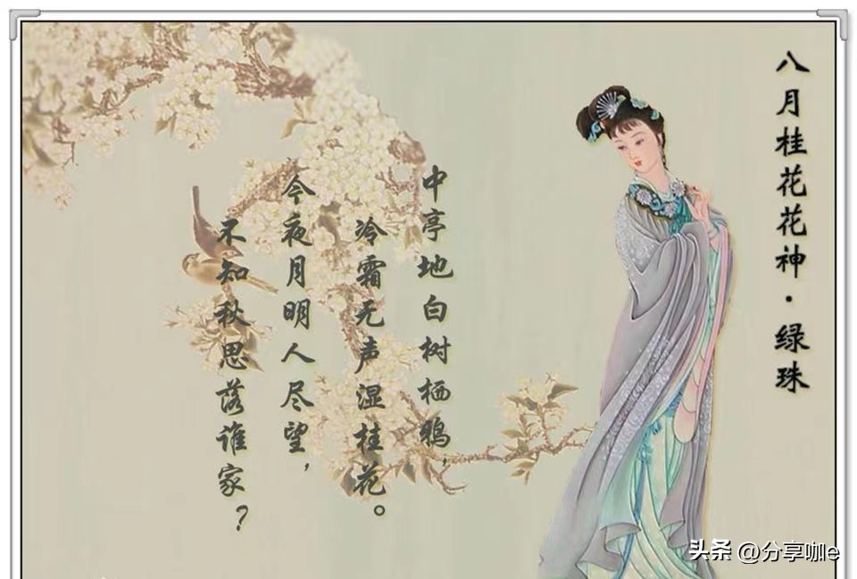 另一种说法是西晋石崇的爱妻绿珠,她容貌美丽并擅长吹笛。赵王司马伦的同党孙秀曾想夺绿珠为妻,导致石崇被赵王杀害,于是绿珠堕楼殉情。人们用桂花的散落来比喻绿珠,并把她封为桂花之神。