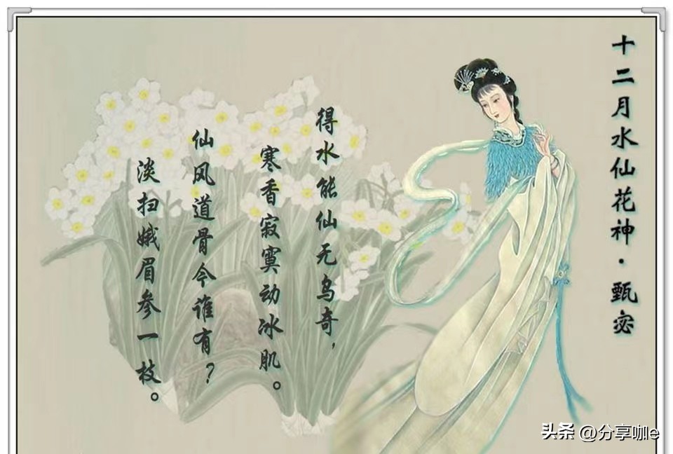 水仙别名金盏银台。水仙花开在蜡梅和江梅之前,为冬令时花,花如其名,绿裙青带,亭亭玉立在清波之上,素洁碧玉般的花朵冒雨而开,超尘脱俗,就像水中的仙子。由于水仙花开于水边,其姿态飘逸清雅,如凌波仙子,人们以洛神为水仙花神。