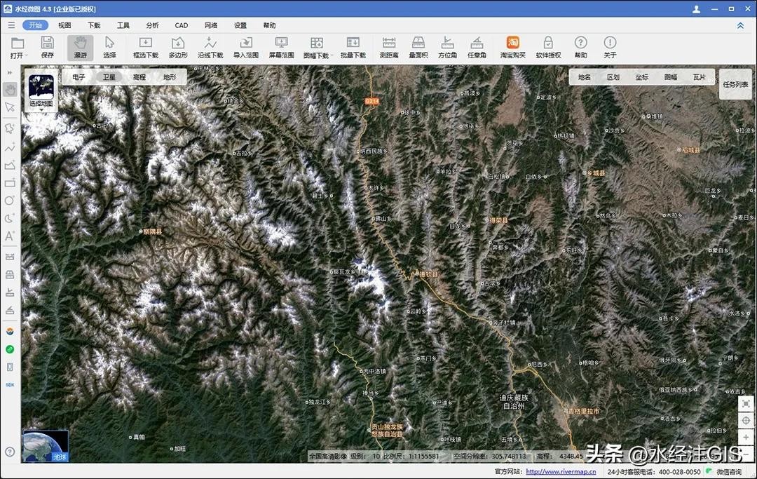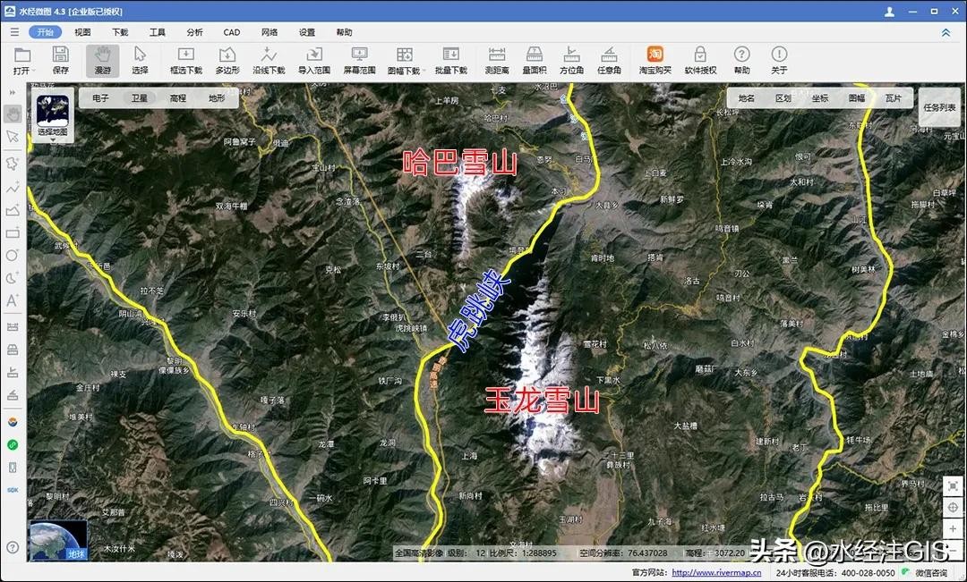 从卫星图上看,江水经石鼓镇拐弯后,一路北上冲向了海拔五千多米的玉龙雪山与哈巴雪山。