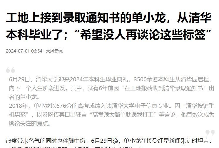 然而,高考结束后的一次采访,却让单小龙意外地陷入了舆论的漩涡。