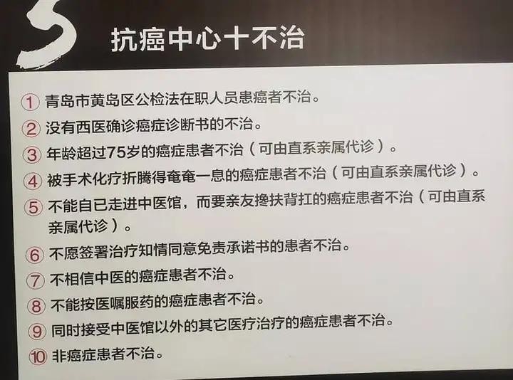 更令人震惊的是,他们的"十不治"名单中,第一条就是"青岛市黄岛区公检法在职人员患癌者不治"。为什么要特意排除这些人?