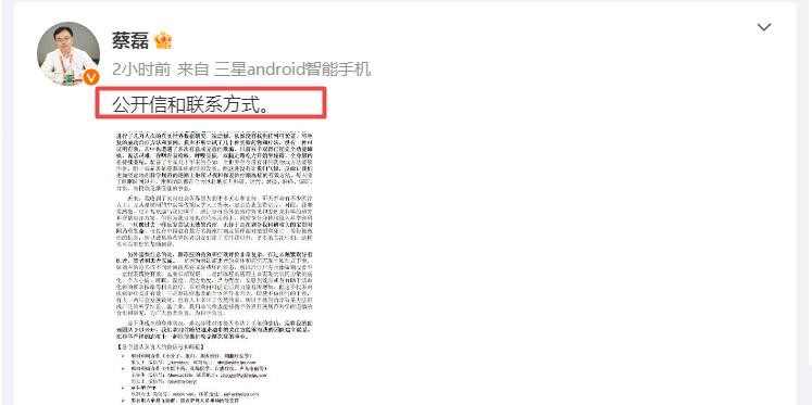 11月16日晚间,蔡磊在社交平台上发出了一封公开信和联系方式,引起了网友们关注。