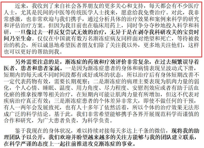 不过,蔡磊建议这些热心的医疗人士更多地去关注其他渐冻患者们,因为他们各个都在等待被救治的机会 。因为目前蔡磊自身也在临床用药,正处于争分夺秒的阶段,一旦像过去一样反复尝试无效治疗,那无异于在剥夺他科研攻关的宝贵时间乃至生命。