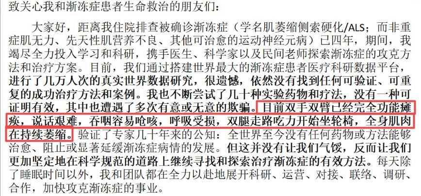 蔡磊用自己的实际经历再次验证了全世界至今没有任何药物或方法能够治愈、阻止或显著延缓渐冻症病情的发展。